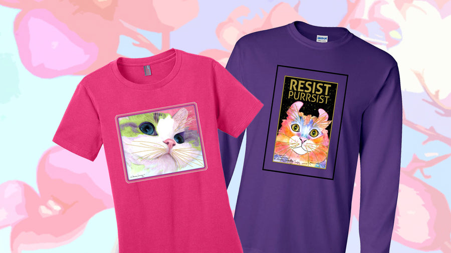 Show off your love of cats with a T-Shirt featuring your favorite cat from Claudia's Cats Collection. "In Stock" shirt designs come on high quality, short sleeve, crew-neck T-Shirts and many are embellished with gold foil or gold metallic ink. "Made to Order" shirts do not have gold accents, but are available in a wider range of styles and colors. See individual product descriptions for details on available cuts and sizes.