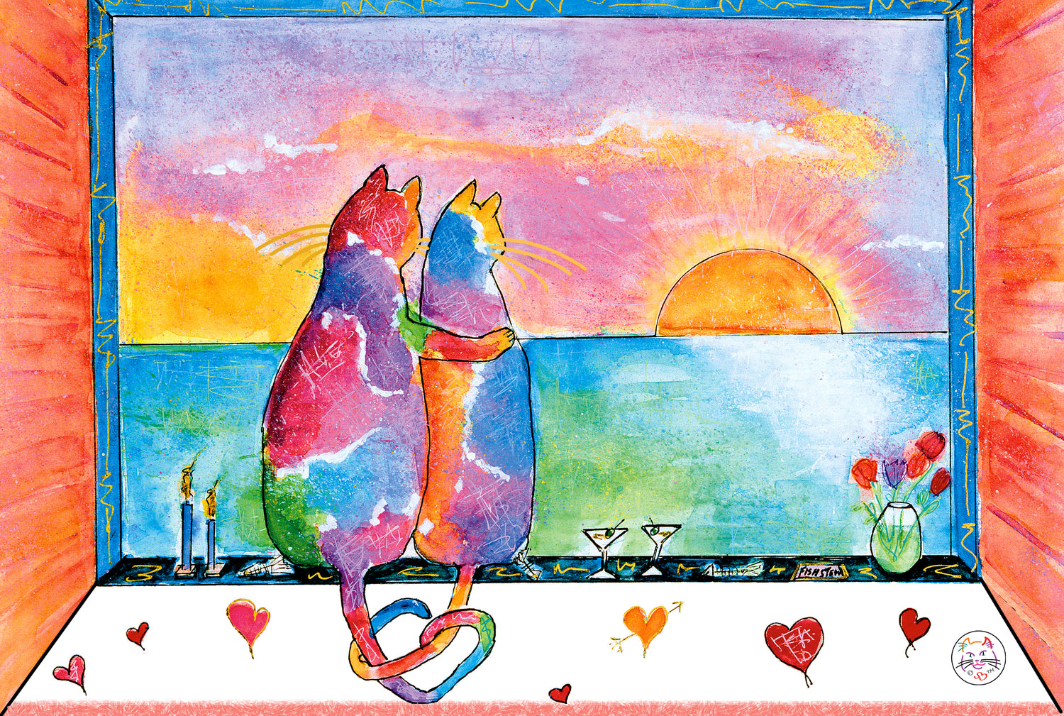This collection of Claudia’s paintings consisted of hand-painted artwork using water media on a variety of substrates including watercolor papers, clay-board, and even plexi-glass. Most pieces were cats, and a few were abstracts. This collection was large and diverse, and contained many of Claudia’s most popular pieces ever including Bootie, Catnip Sip, Holly Hula Cat, and Two Cats in Love.