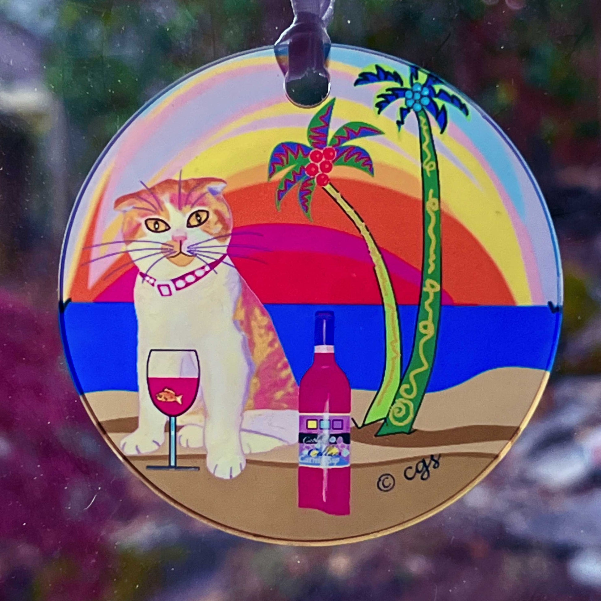 Aloha Lucy, cat art by Claudia Sanchez, is featured on this decorative Christmas Ornament. These flat round ornaments measure 3” across. Choose from Porcelain or Clear Acrylic.
